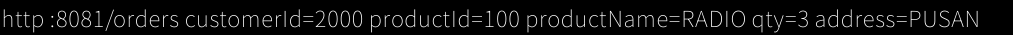 http :8081/orders customerId=2000 productId=100 productName=RADIO qty=3 address=PUSAN